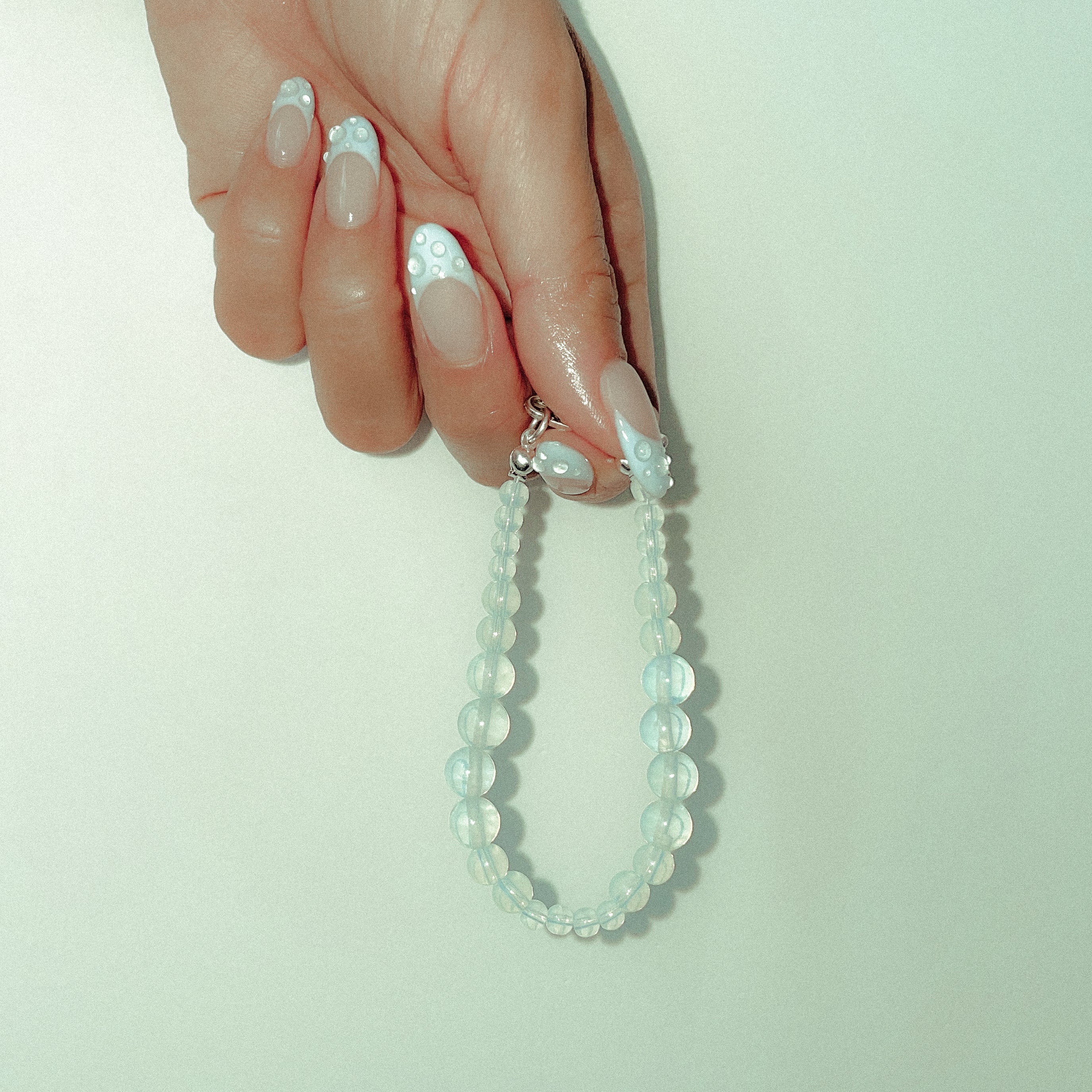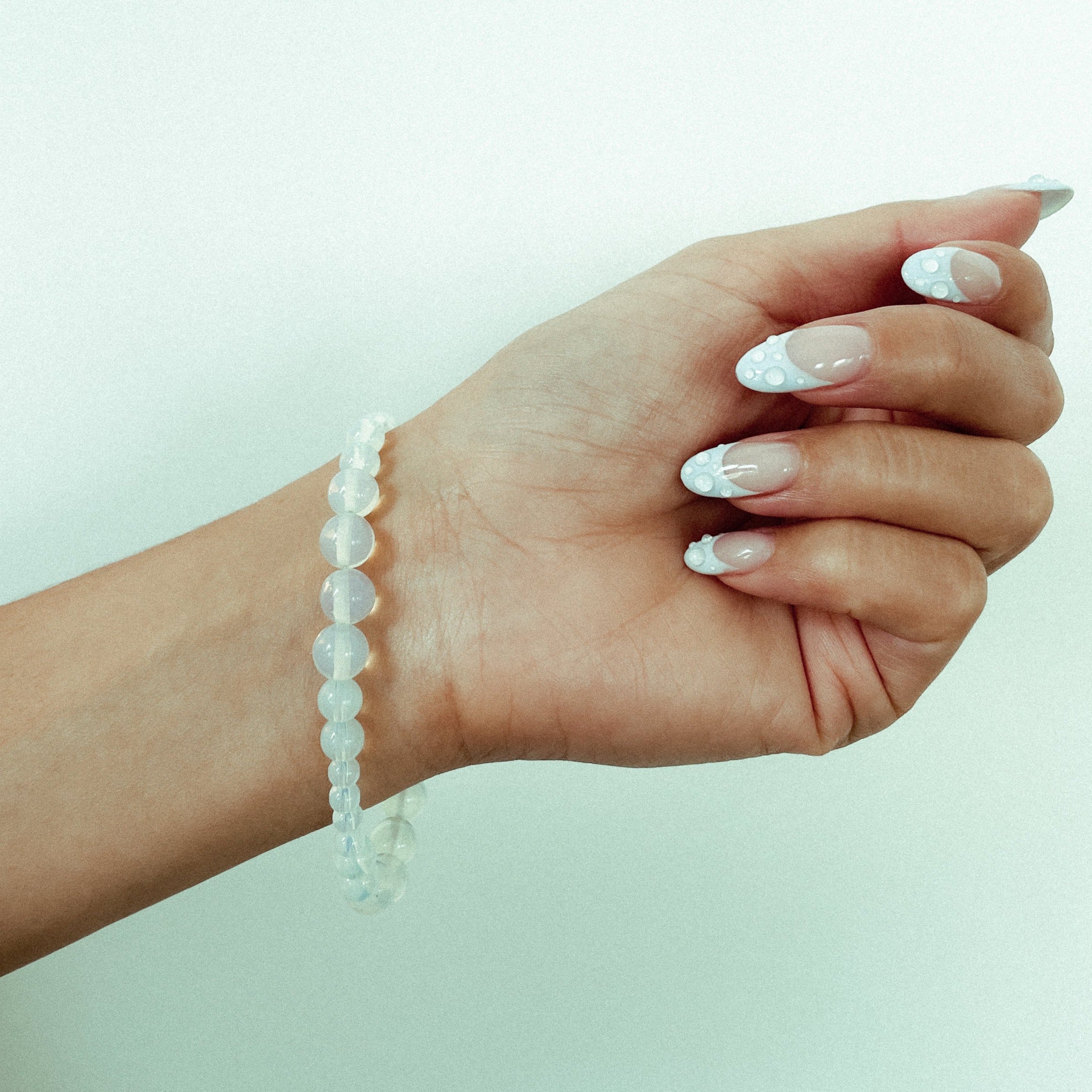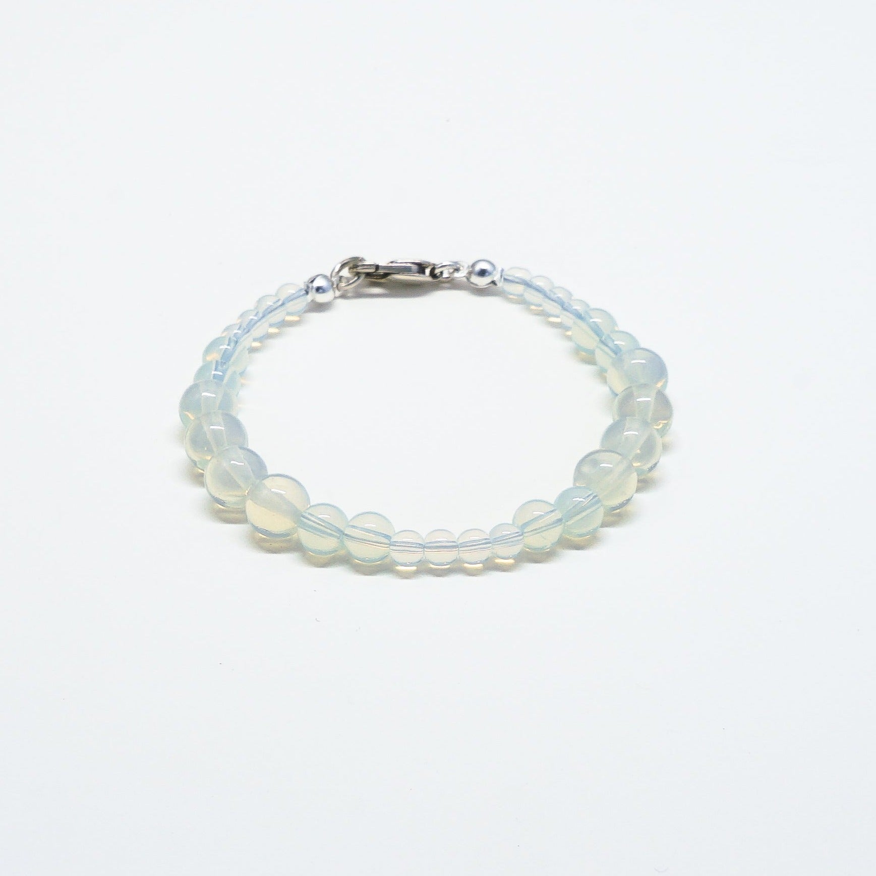 The Bliss Beaded Bracelet features a string of multi-sized glass opalescent, moonstone colored beads joined by a sterling silver clasp.
