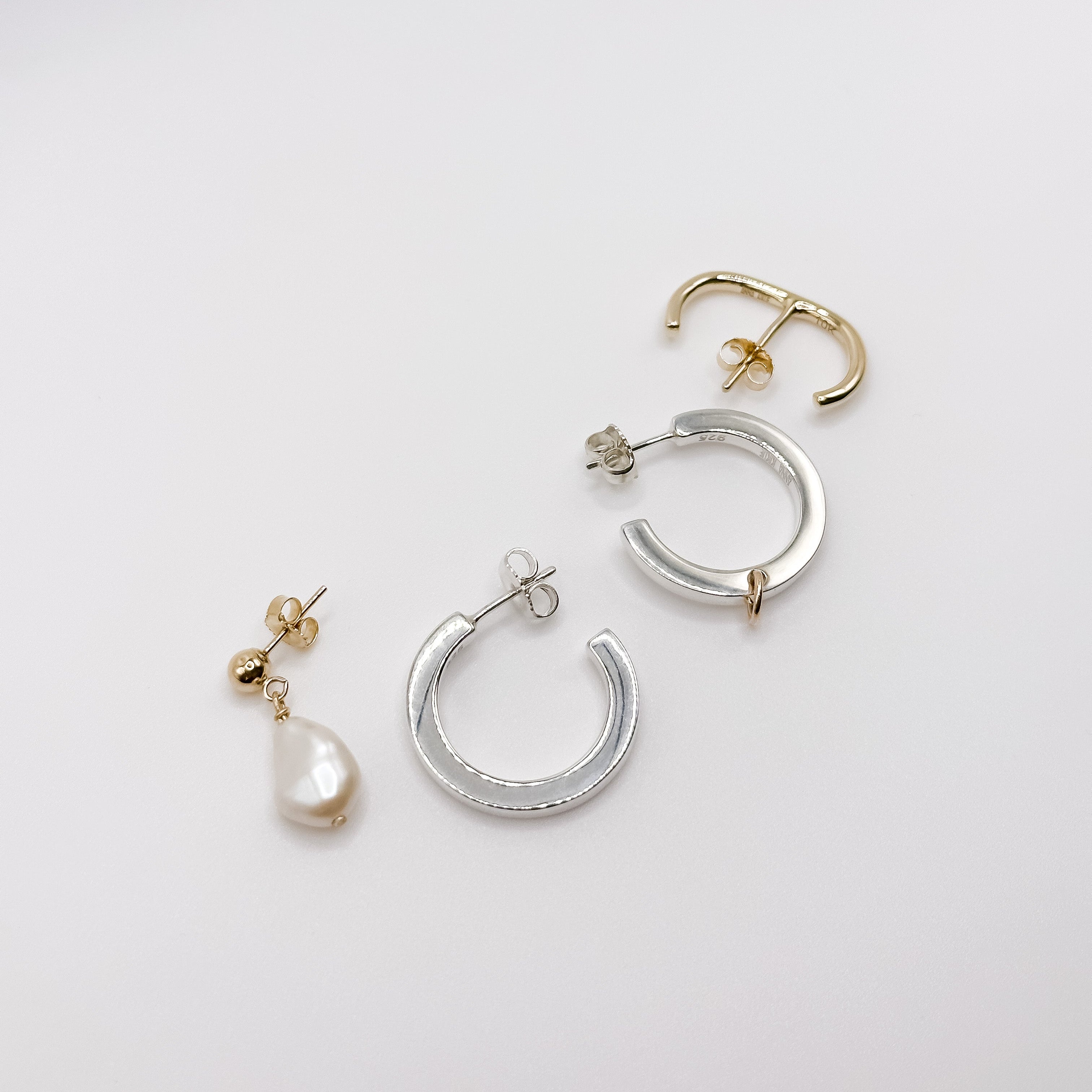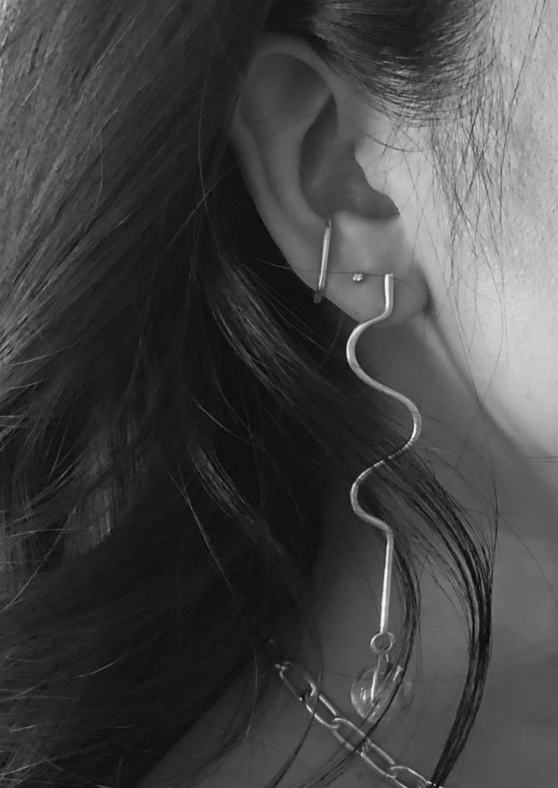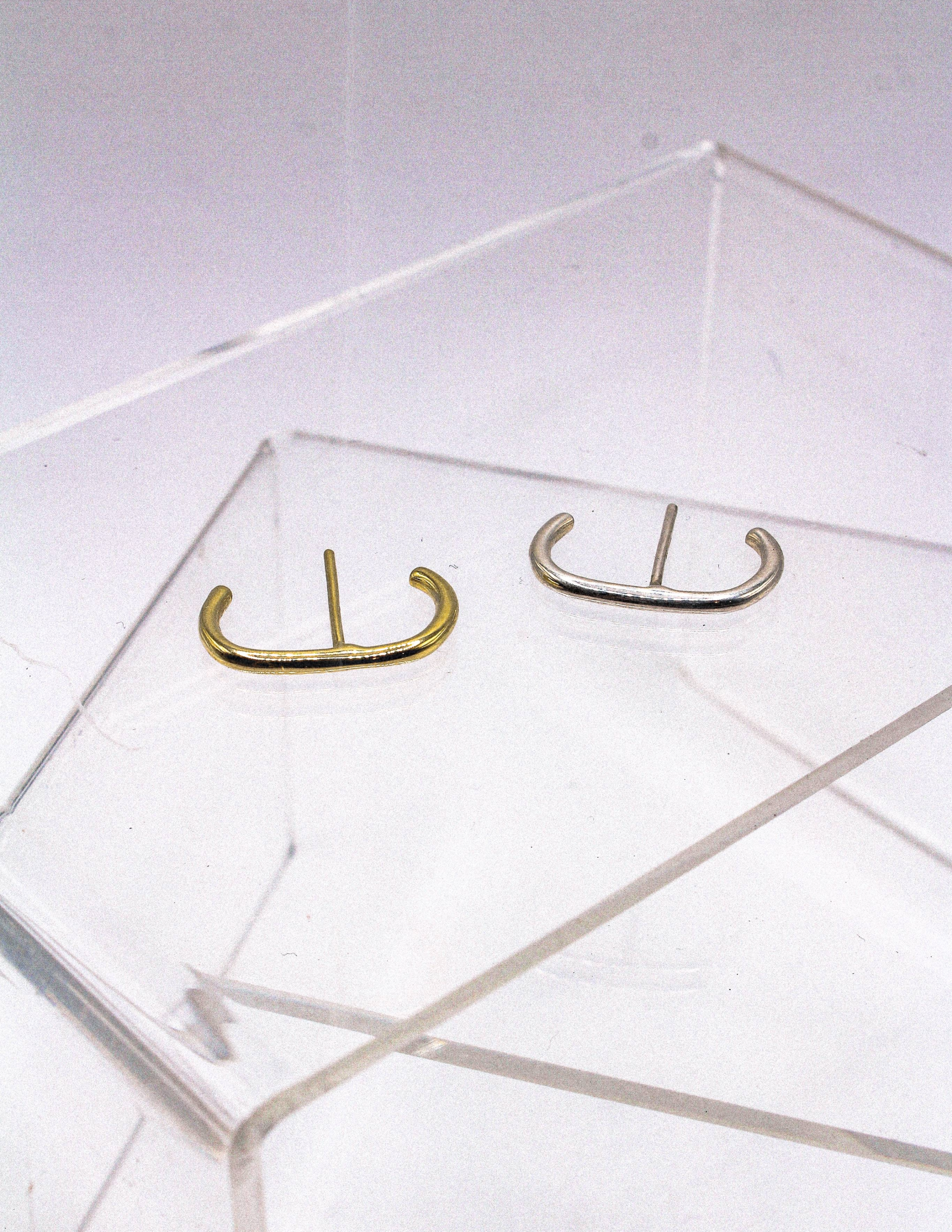 The Curved Suspender Earring features a rounded bar that appears to hang vertically from your inner ear and extend behind your ear lobe. The earring can also be worn horizontally.