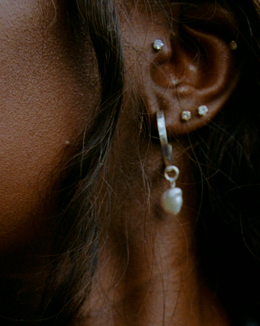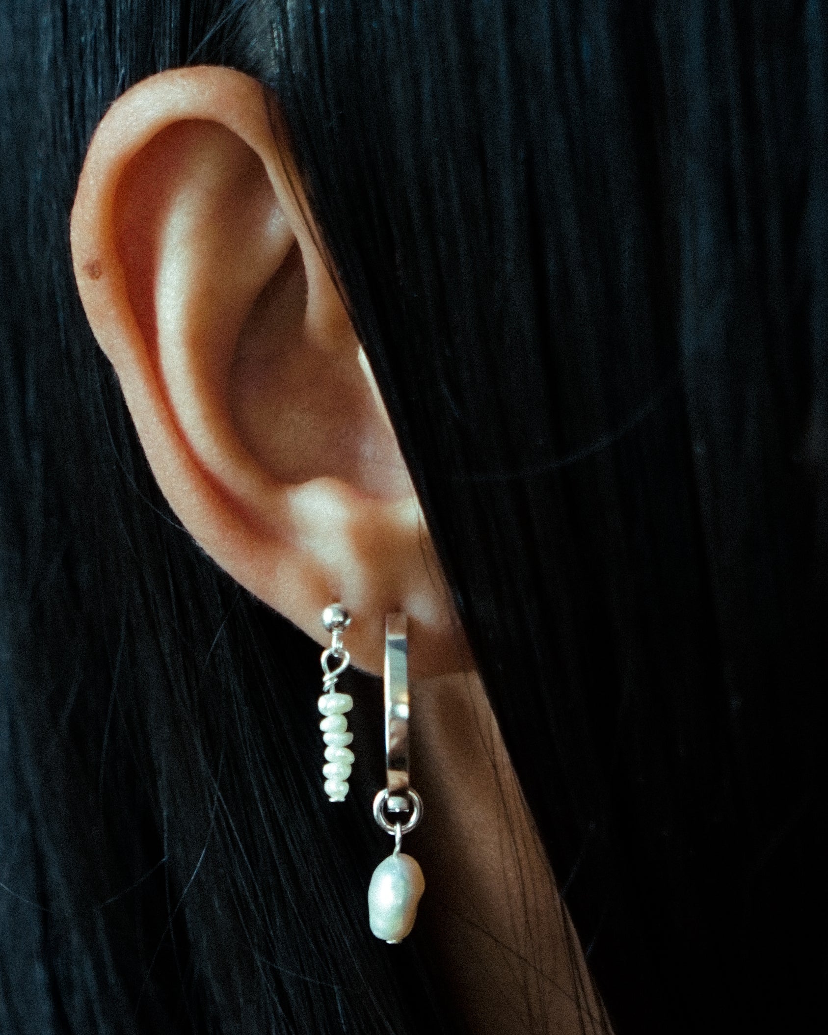 The Escape Mini Block Hoops feature a set of sterling silver rectangular open hoops with a ~7mm baroque keshi pearl hanging from a small ring piercing the bottom of the earring.