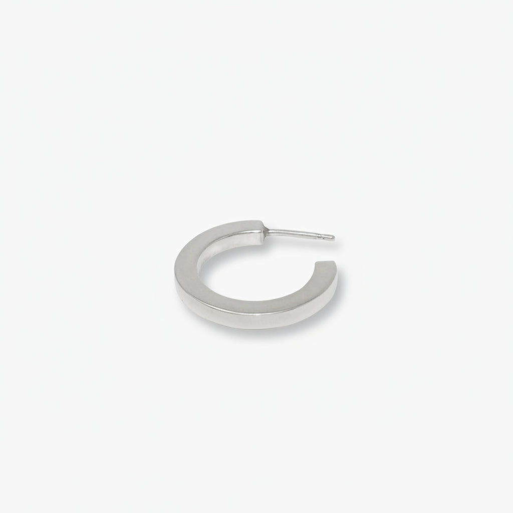 A single rectangular sterling silver hoop earring against a white background.