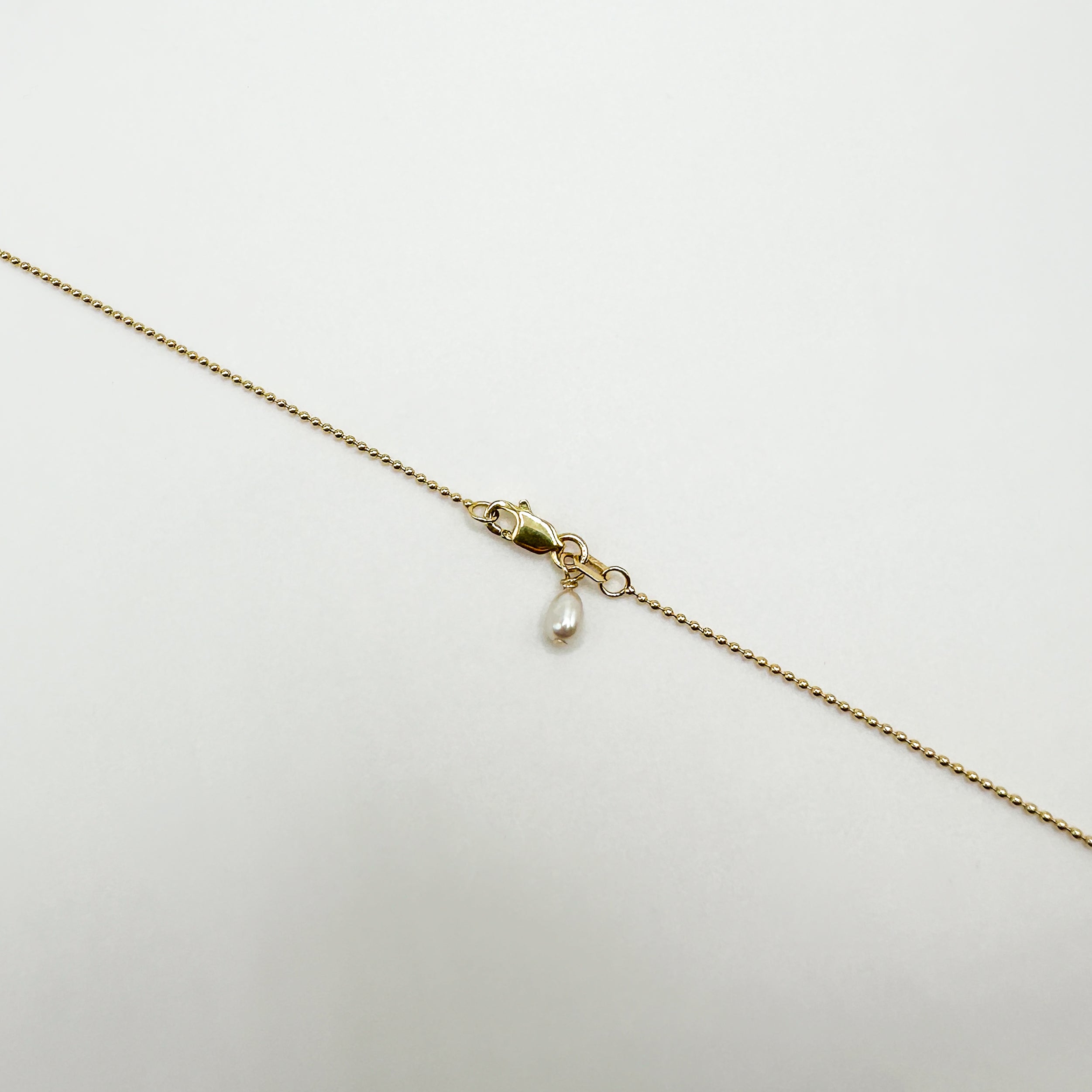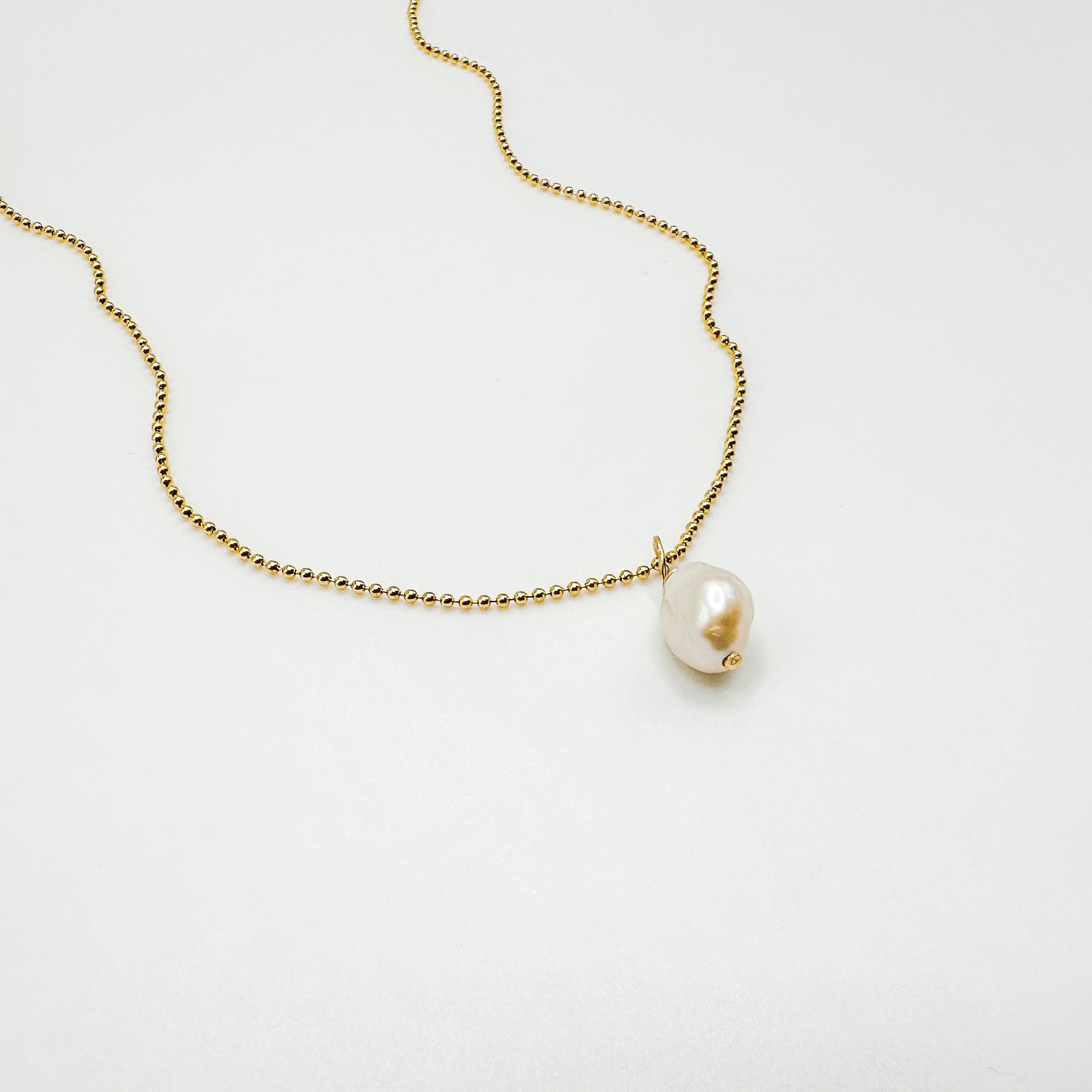 The Ni-gatsu Necklace features a delicate 14K yellow gold ball chain with a 7-8 mm baroque pearl pendant and accent pearl on the clasp.