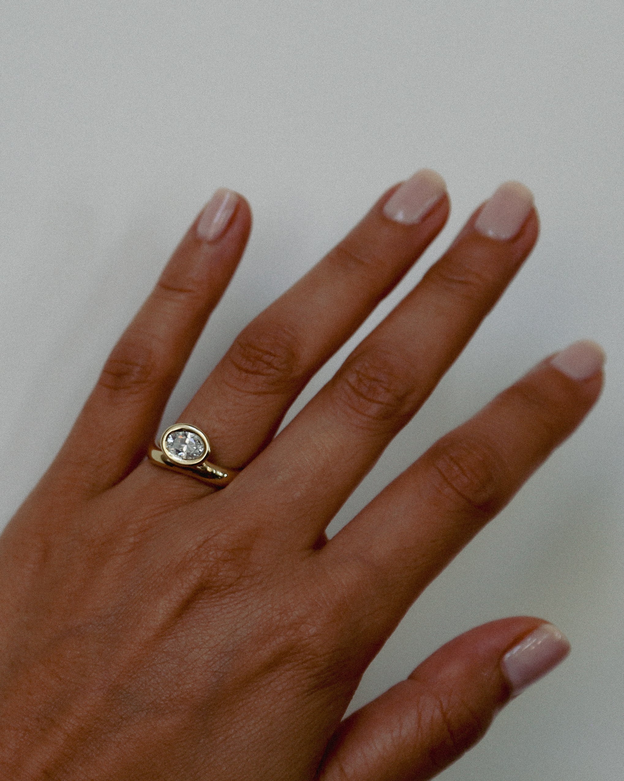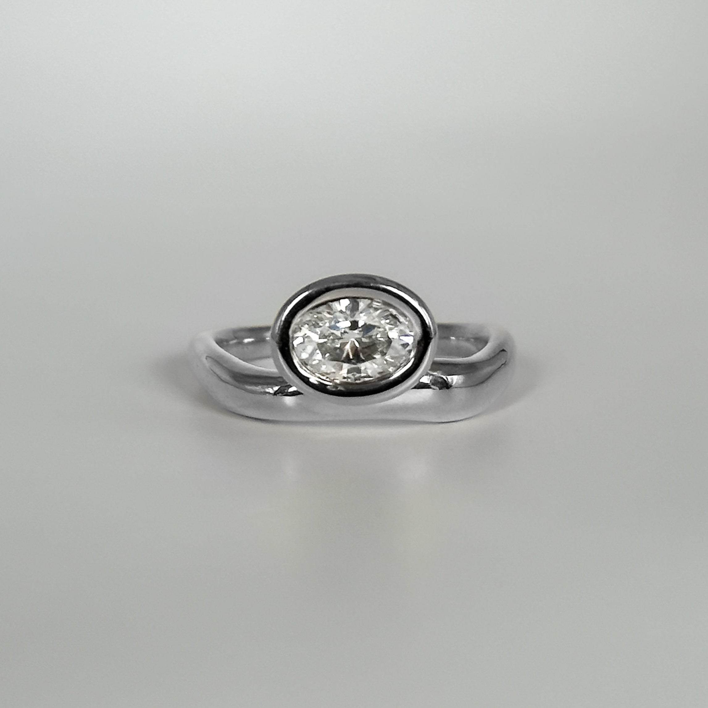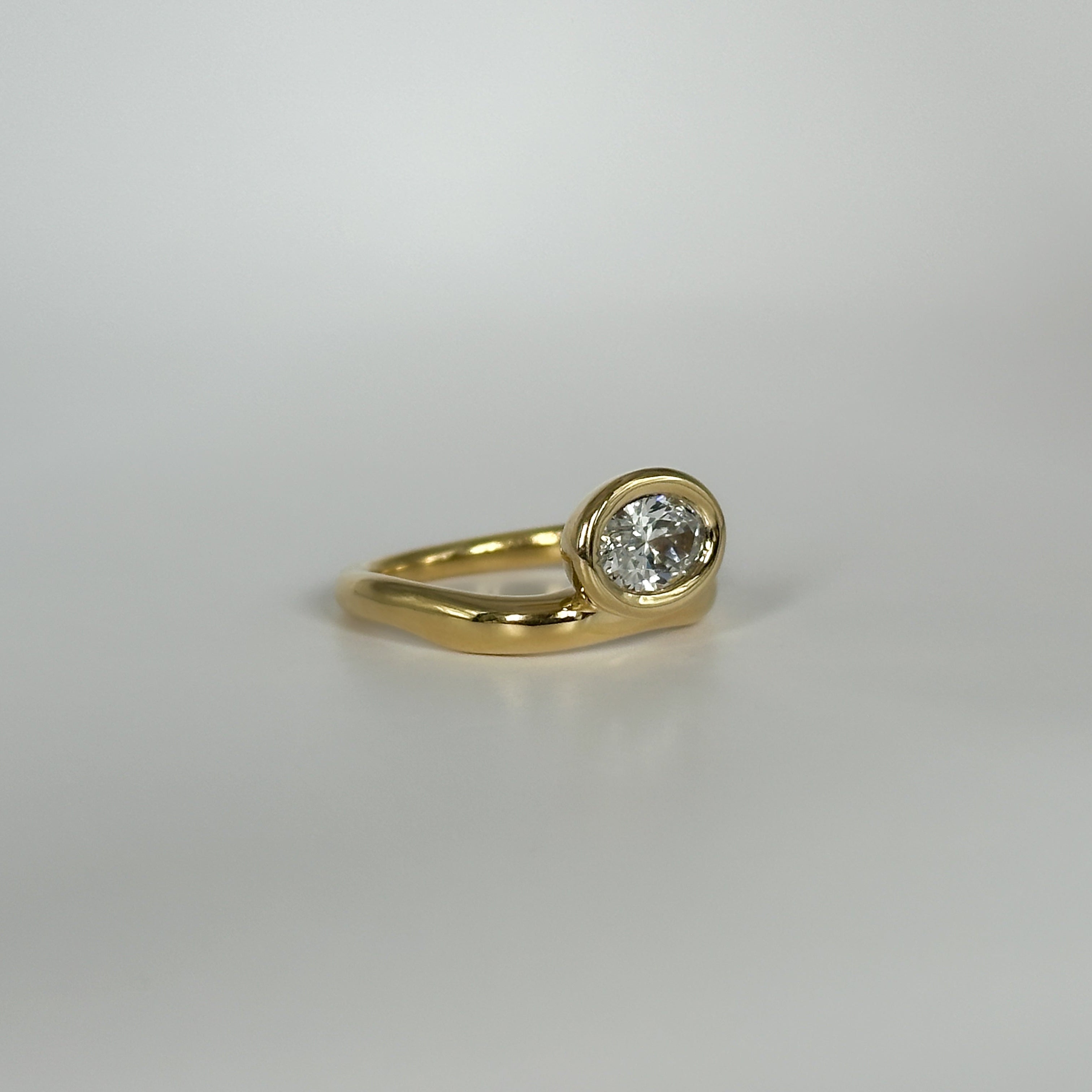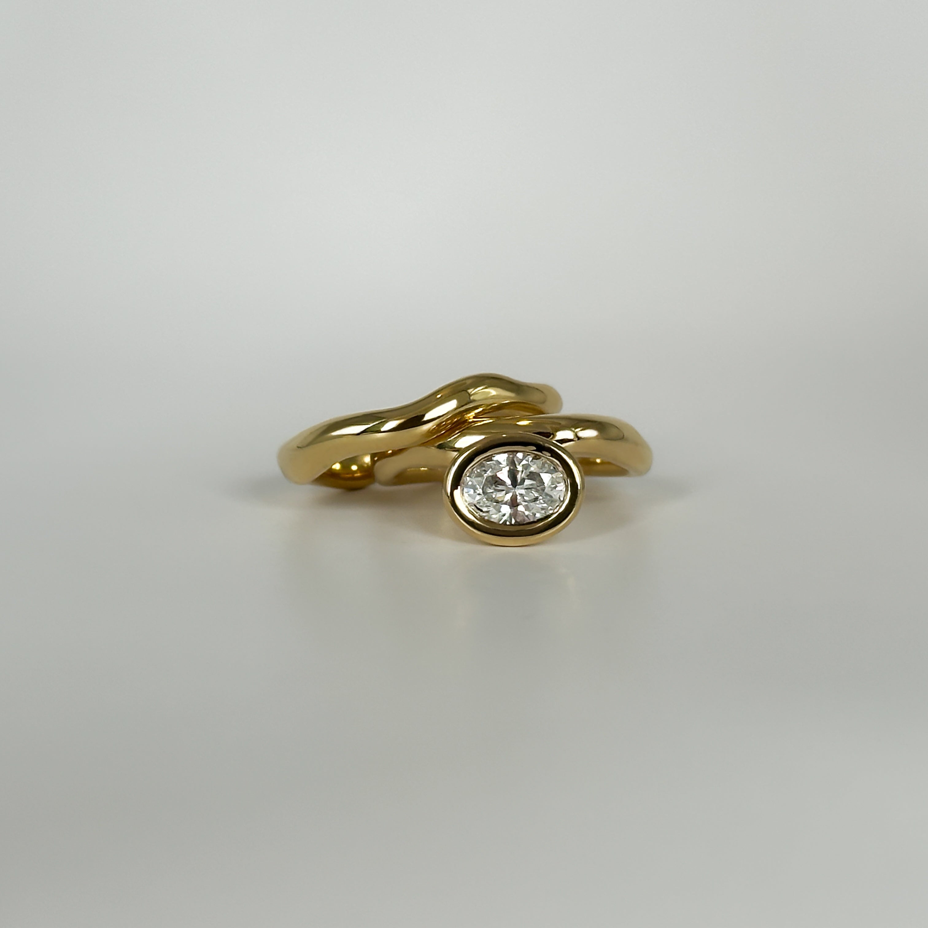 The Resonance Solitaire features an oval-cut natural diamond, secured in a softly rounded bezel that sits asymmetrically along the wavy band. Designed to be worn in two orientations, the stone can rest above or below the curve, offering versatility in styling. Its fluid form tapers to a 2 mm base and stacks seamlessly with the Resonance Band.