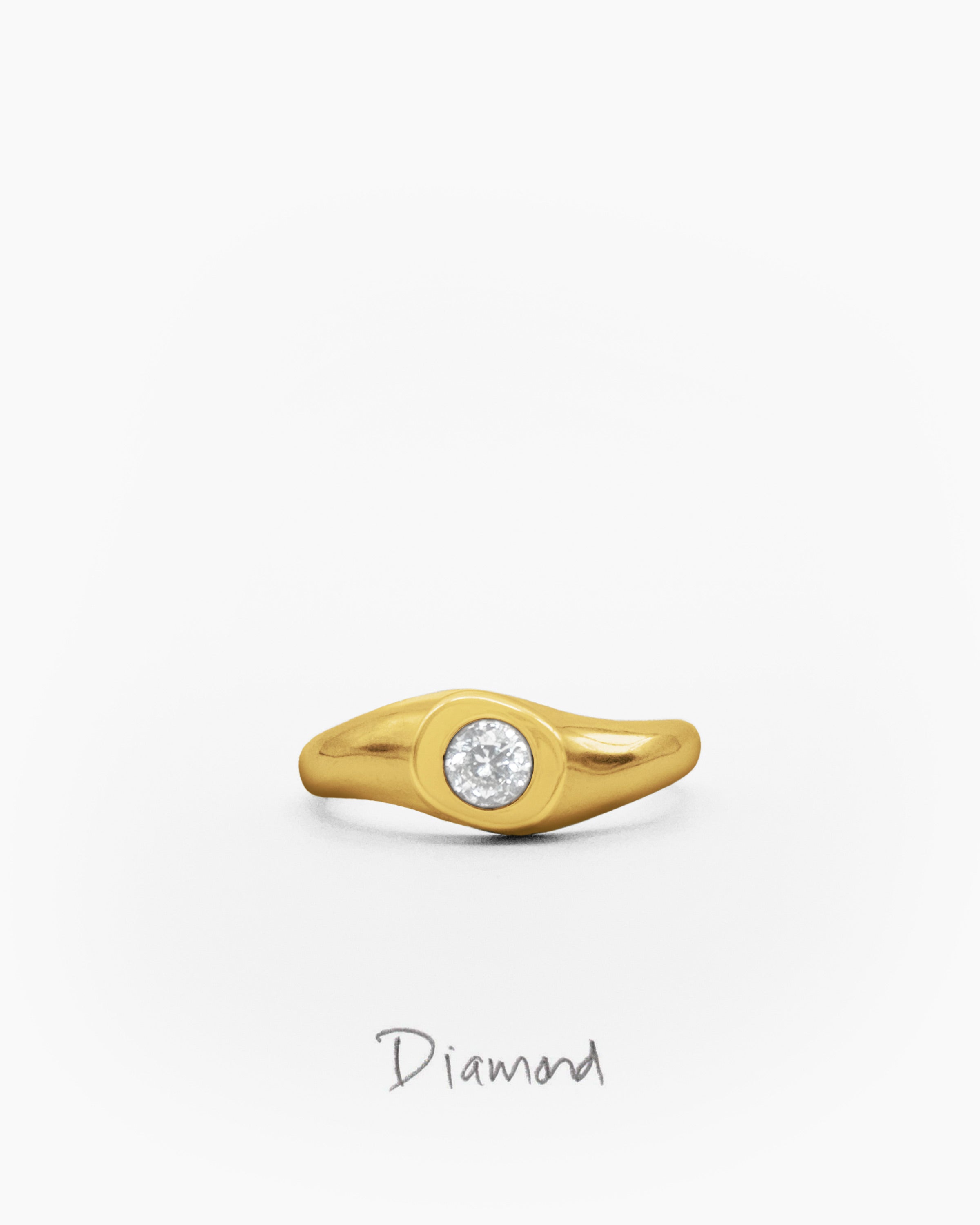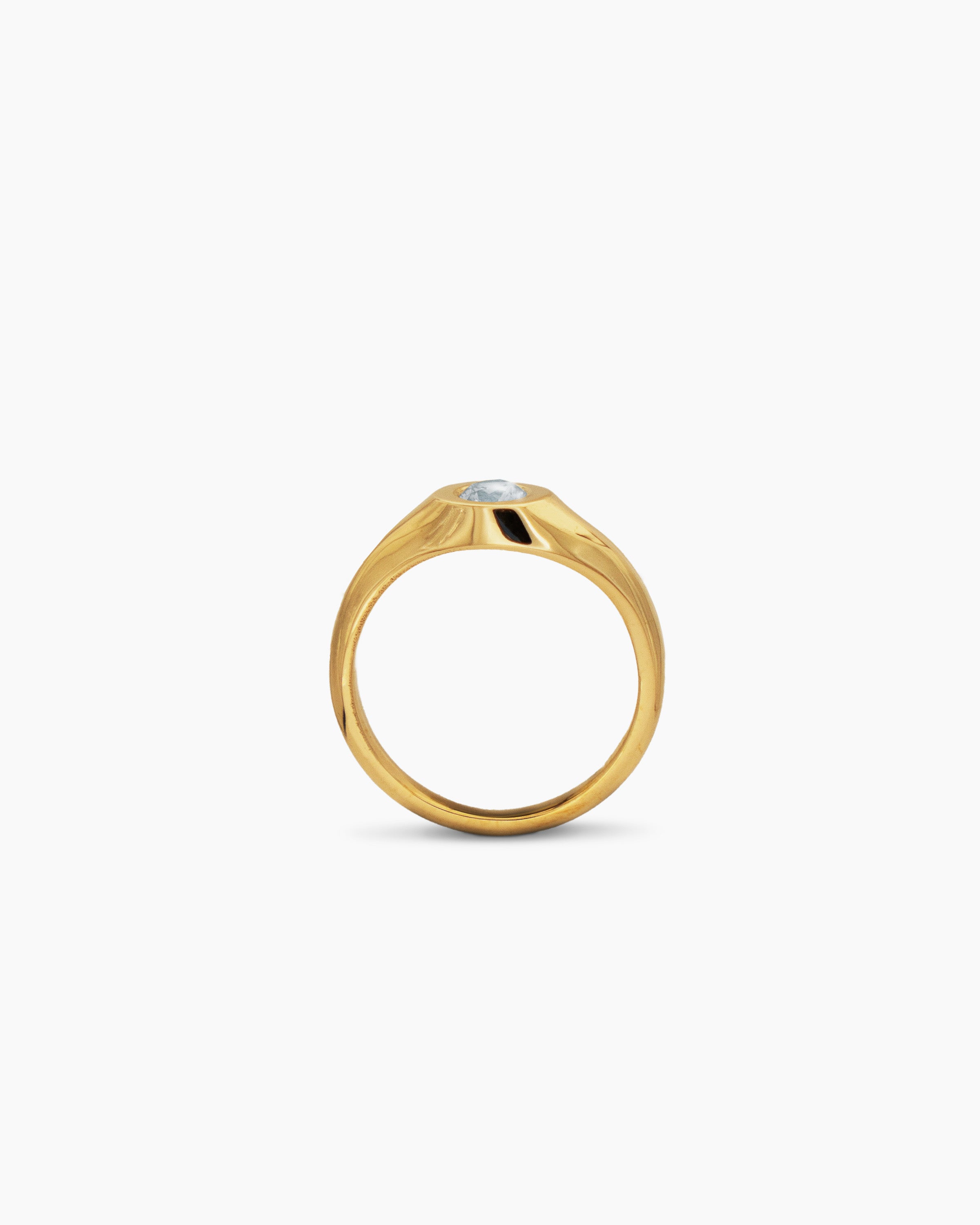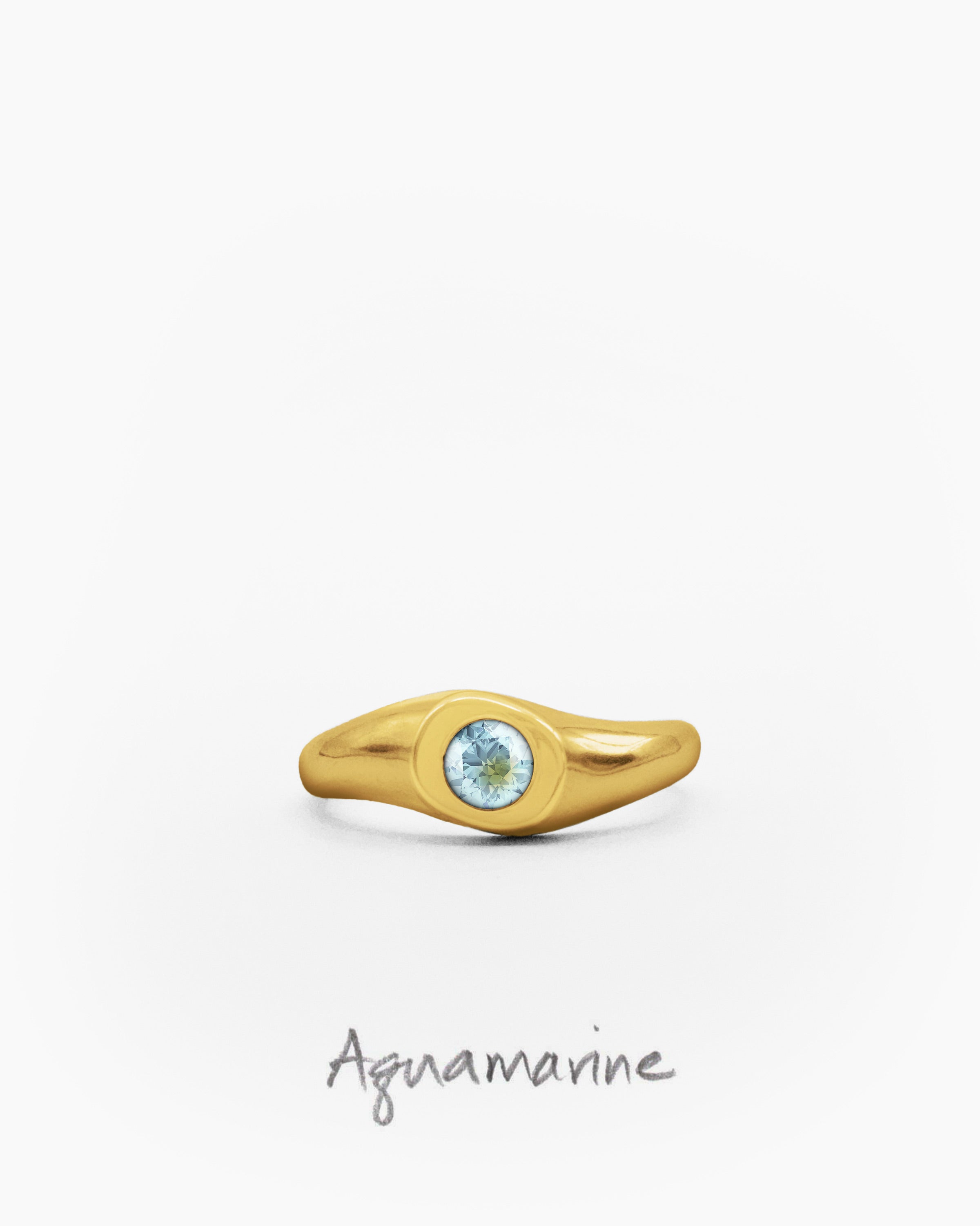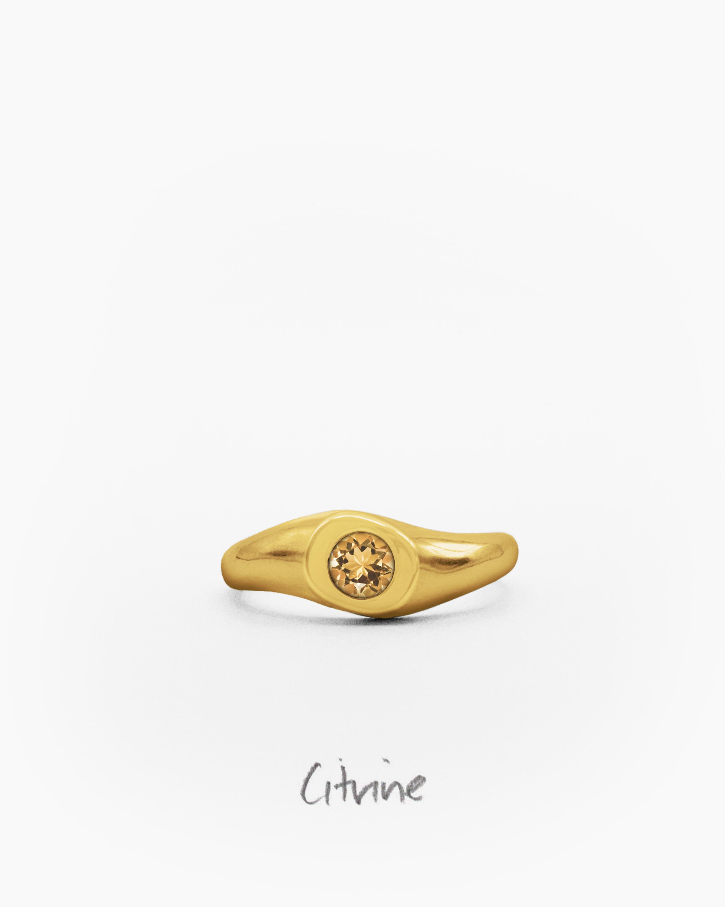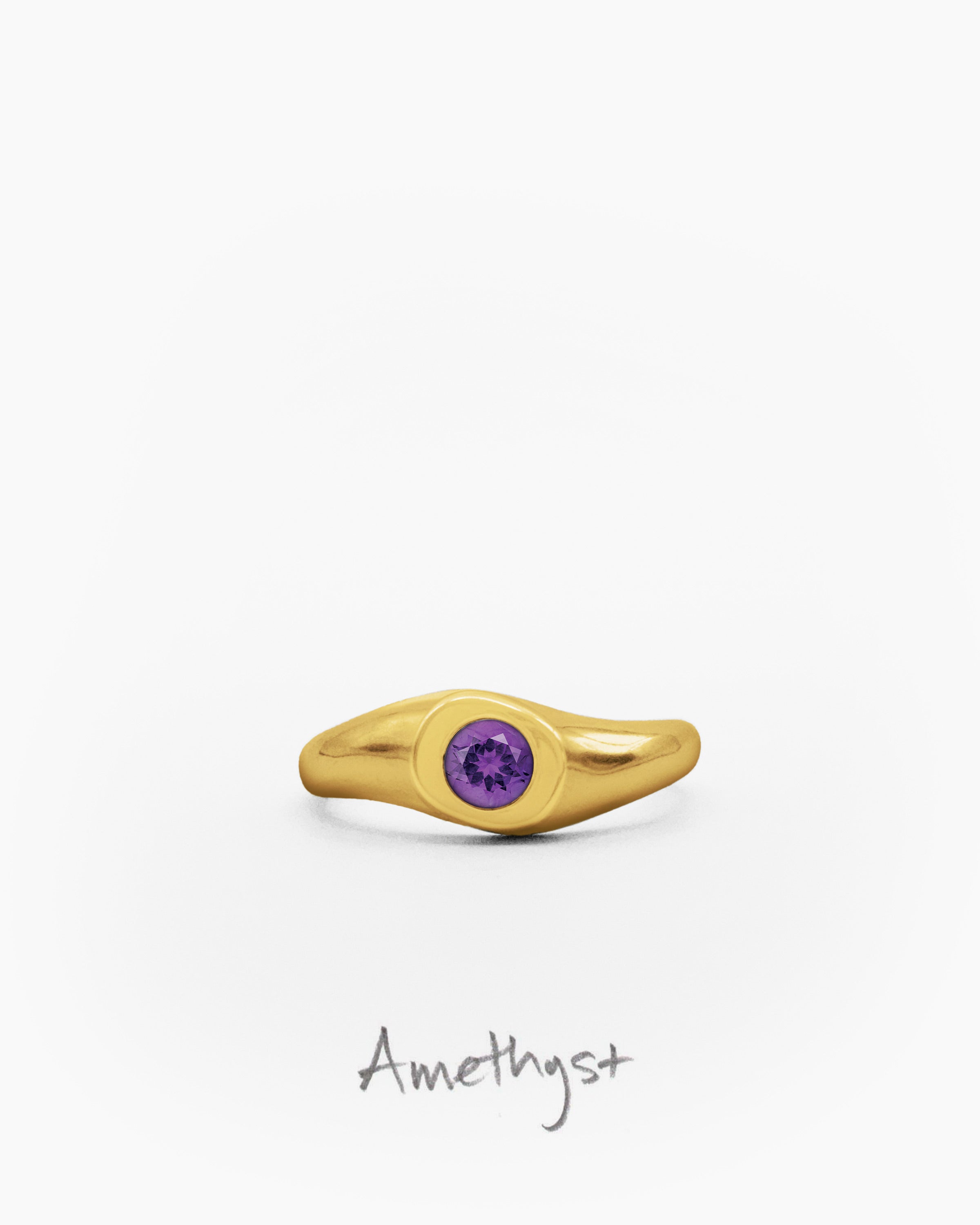The Shift Signet Ring is a literal twist on the first-generation AK Signature Signet, featuring an asymmetrical, curving ring design. The signet face showcases a round-cut, natural gemstone of your choice, set within a rectangular frame.