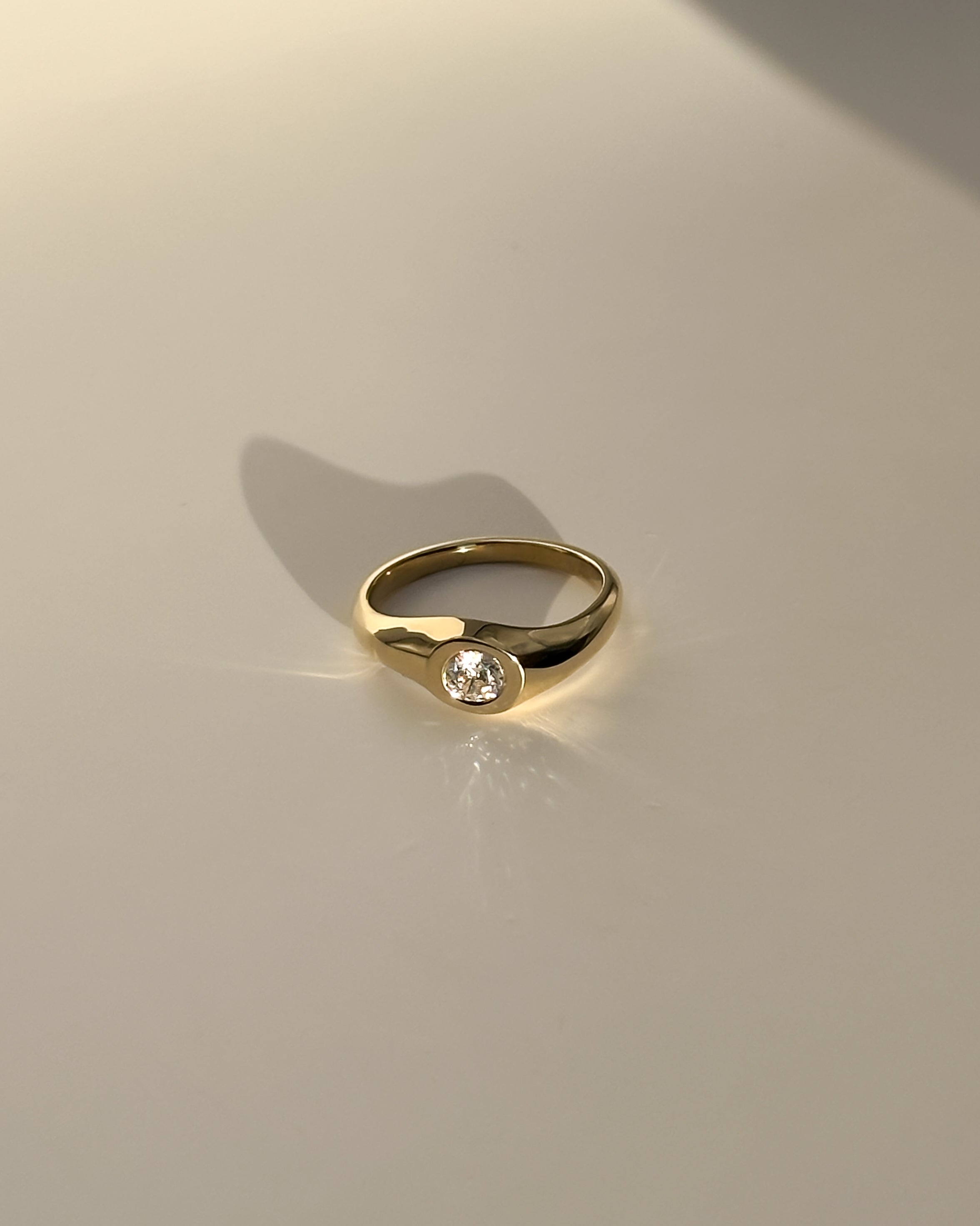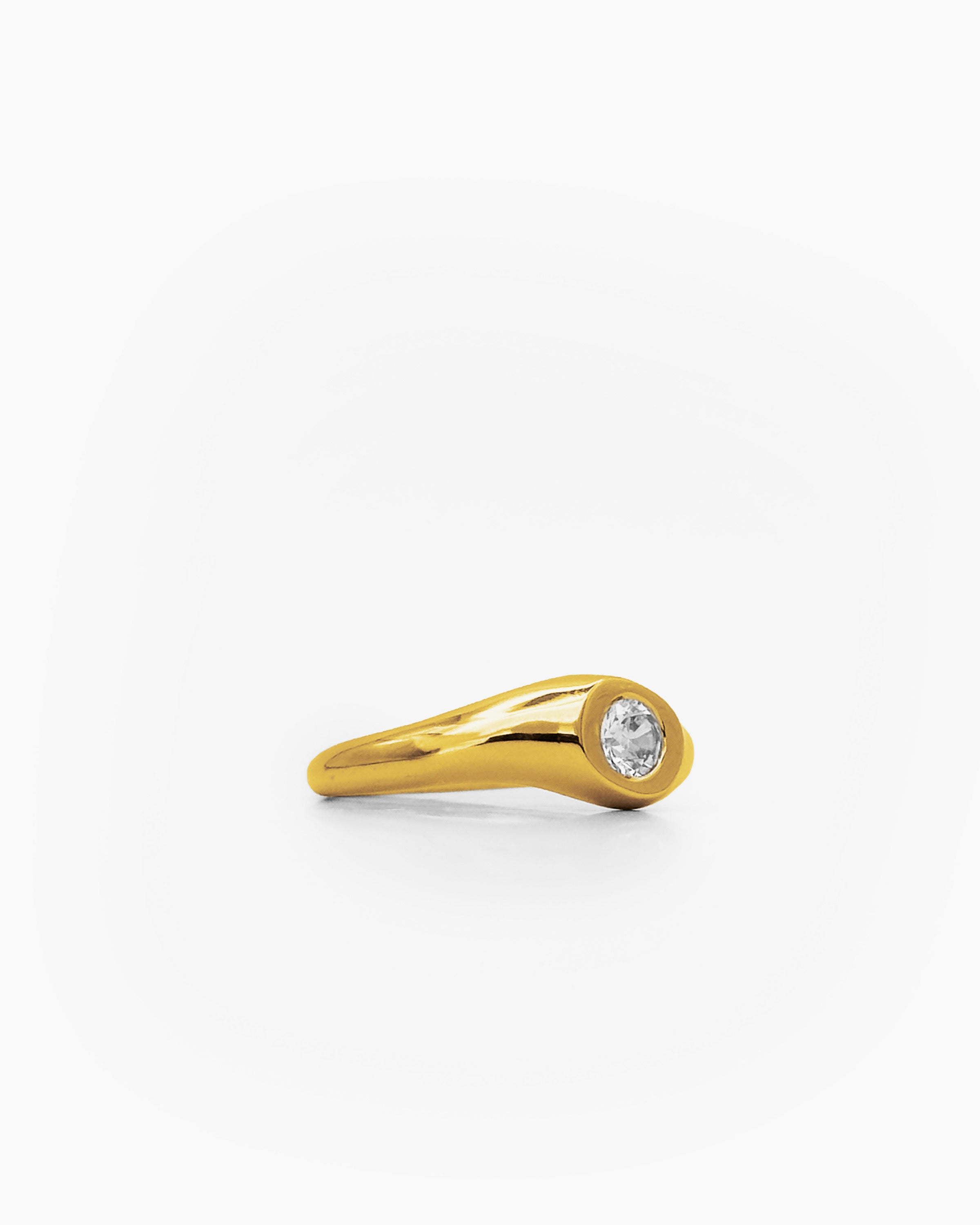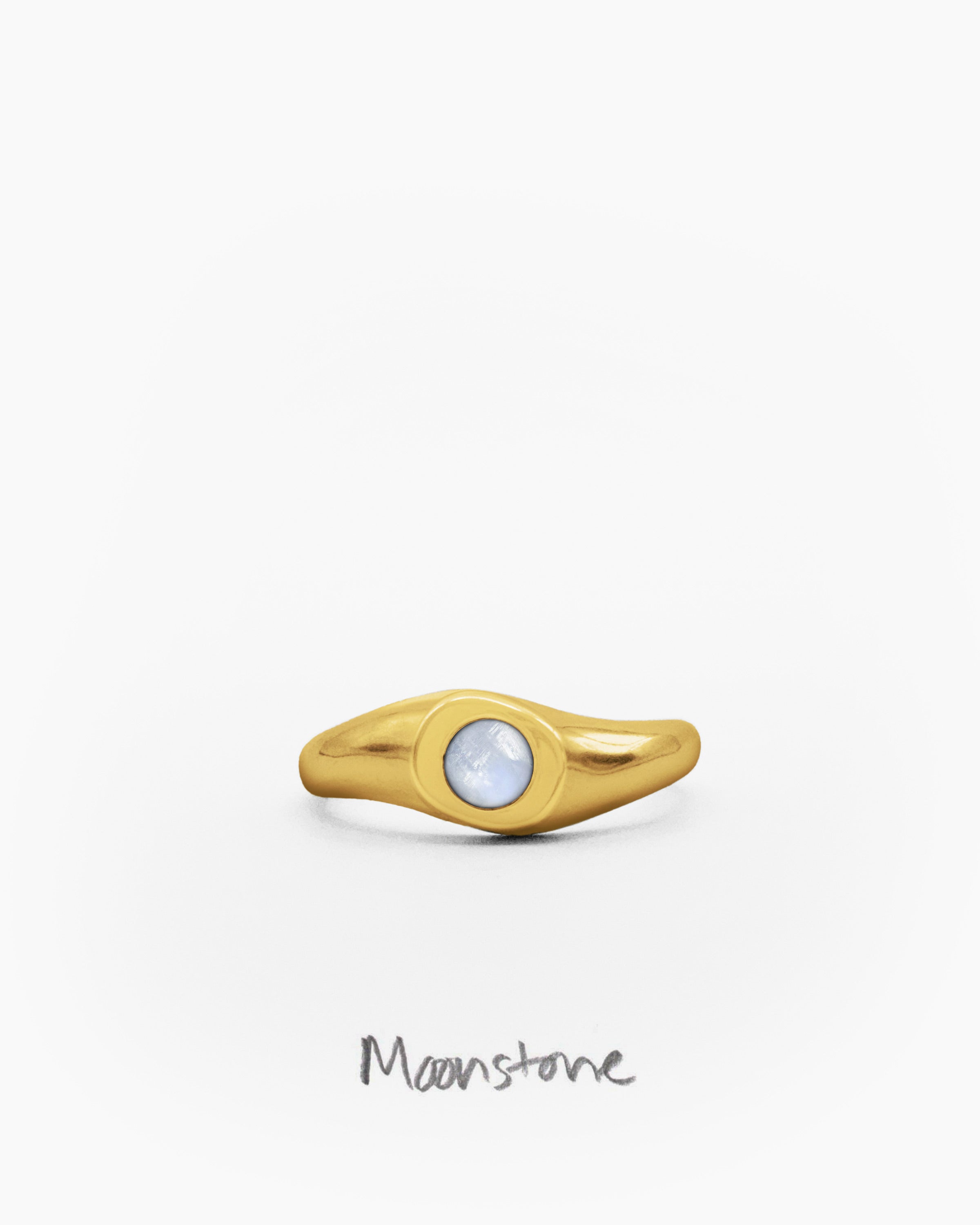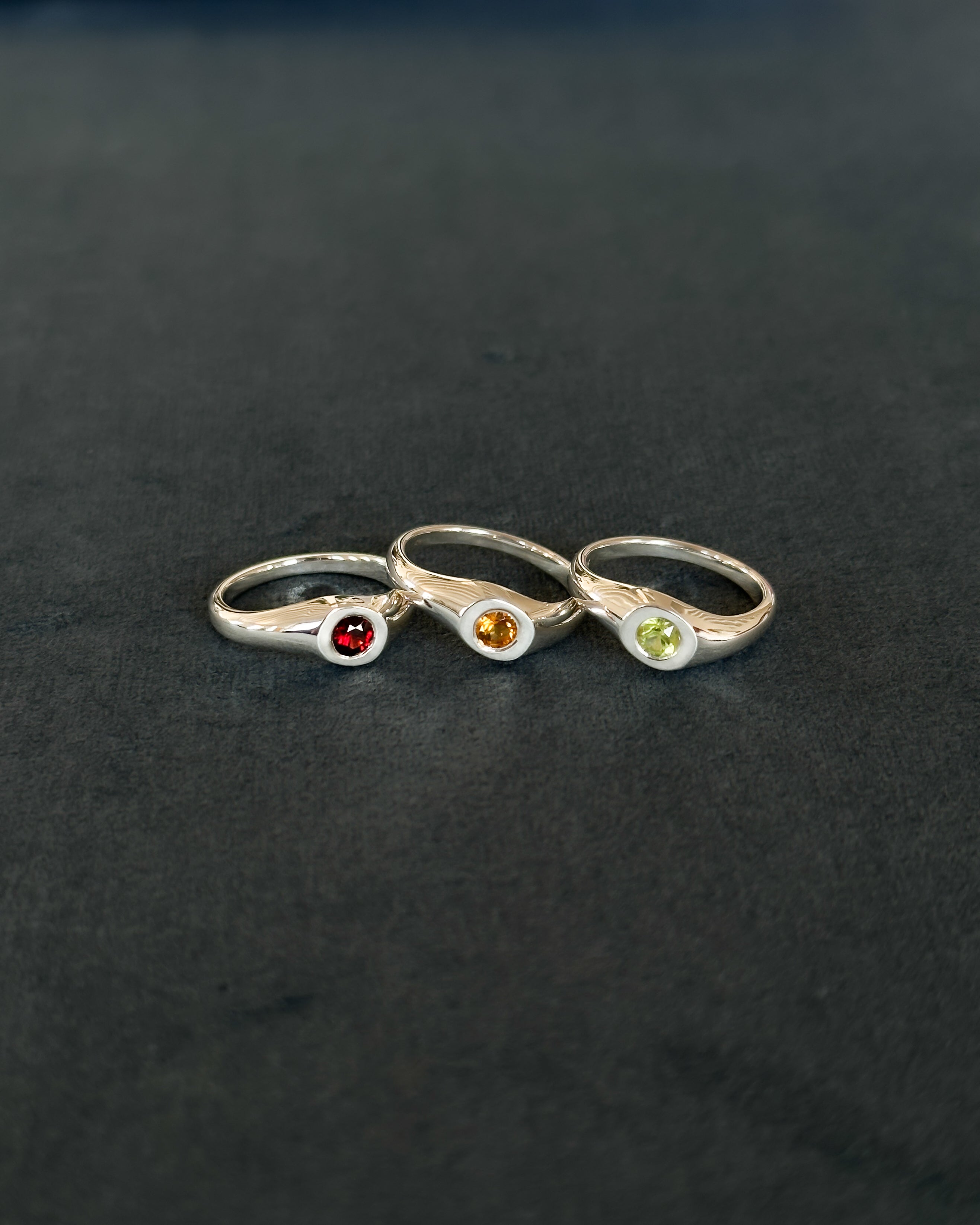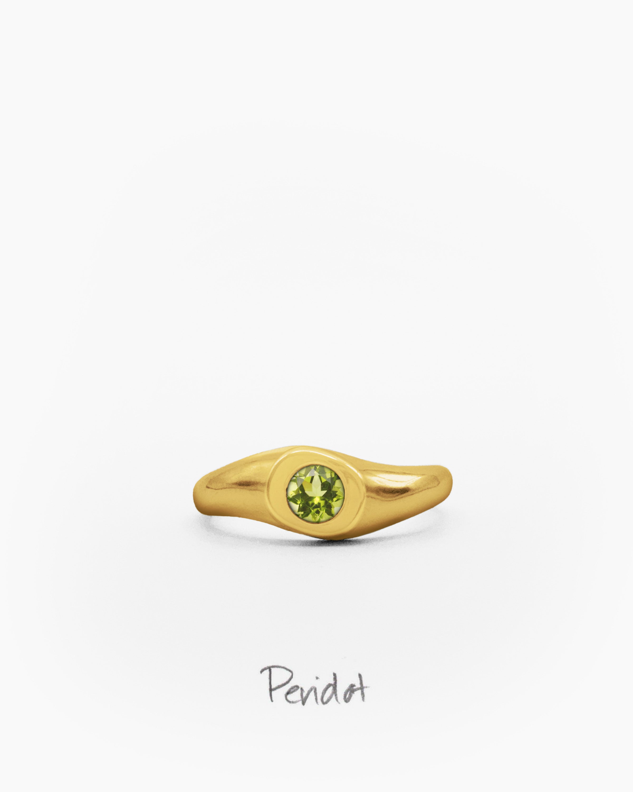 The Shift Signet Ring is a literal twist on the first-generation AK Signature Signet, featuring an asymmetrical, curving ring design. The signet face showcases a round-cut, natural gemstone of your choice, set within a rectangular frame.