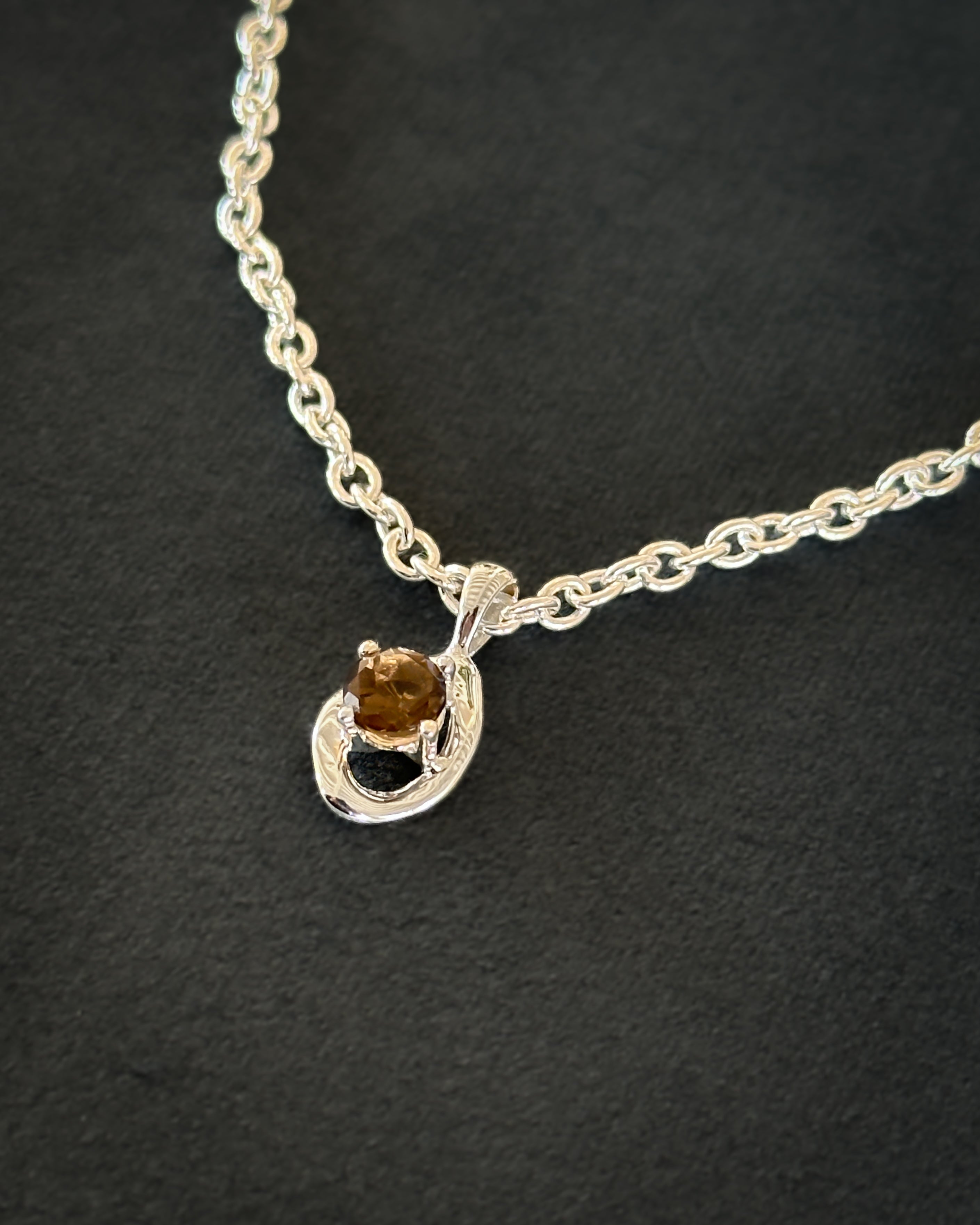 This limited edition large silver Nadia Pendant design sculpts the bold, singular link around a basket-set, 6 mm round-cut smoky quartz gemstone. The pendant is strung on a bold 2.8 mm silver cable chain.